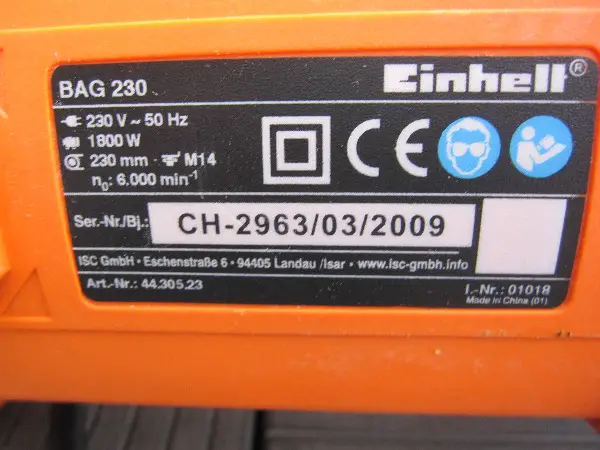 Technische Daten: Leistung: 1.800 Watt, 230 V, 50 Hz, M 14, Umdrehungen: 6.000 min., Scheiben-Durchmesser: 230 mm, Gewicht: 4 kg.