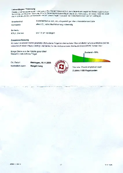 Baujahr Oktober 2022, Erstflug Frühling 2023, ca. 100 h Flugzeit insgesamt.