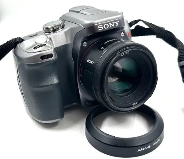 Kombi mit dem lichtstarken (1.4! ) Sony 50mm. Seltenere Silbervariante der A100!