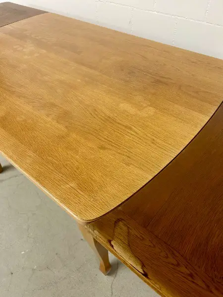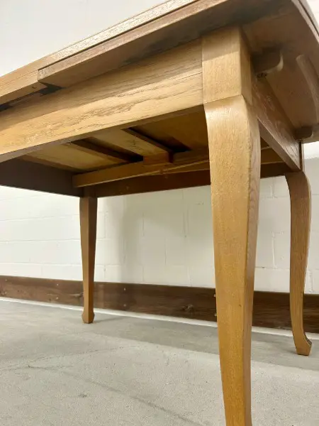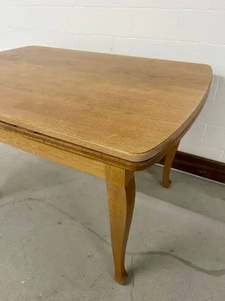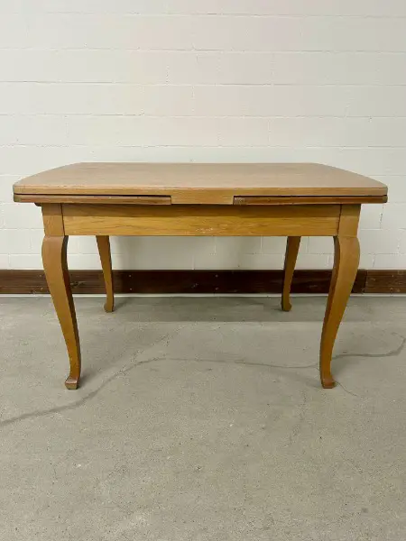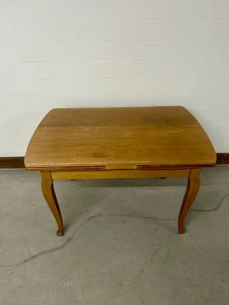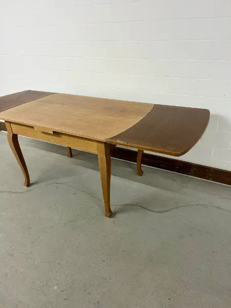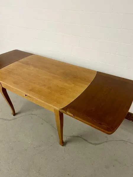 Tisch lässt sich mühelos mit zwei Ansteckplatten verlängern. Er befindet sich in einem guten, gebrauchten Zustand und weist diverse Gebrauchsspuren auf (siehe Bilder) . Perfekt für gemütliche Stunden zu zweit oder gesellige Runden mit Freunden.