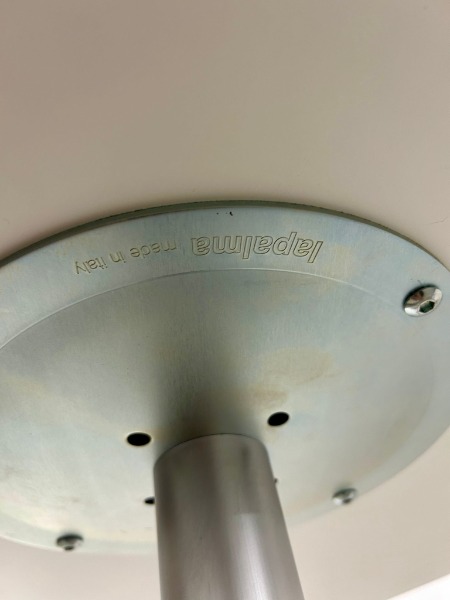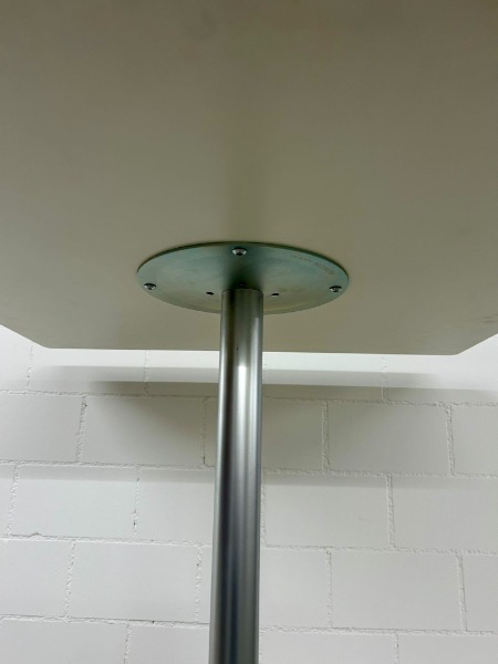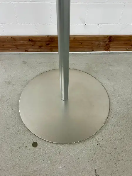 Sockelplatte wurde mit Edelstahl verkleidet und der runde Tischfuss ist matt verchromt. Die