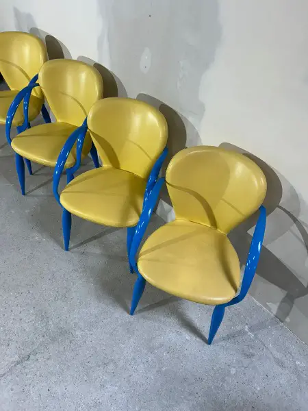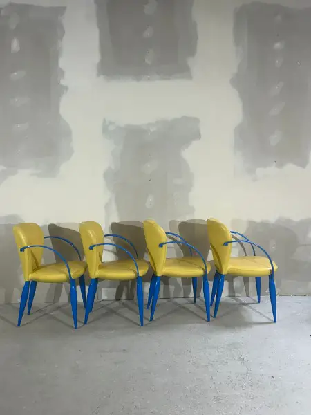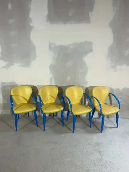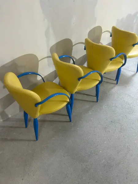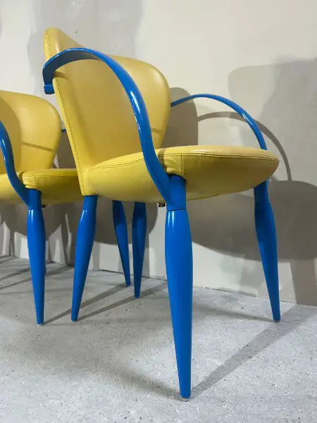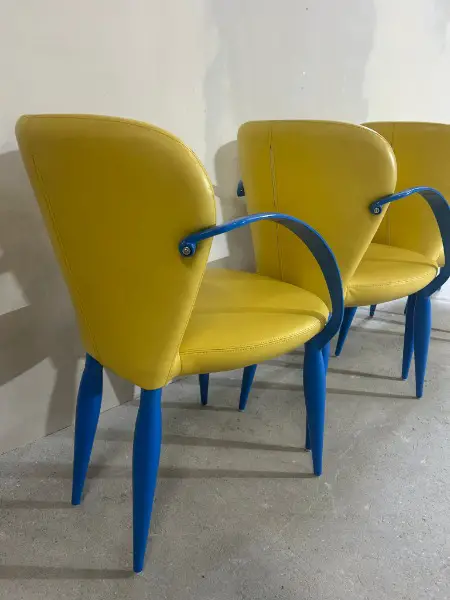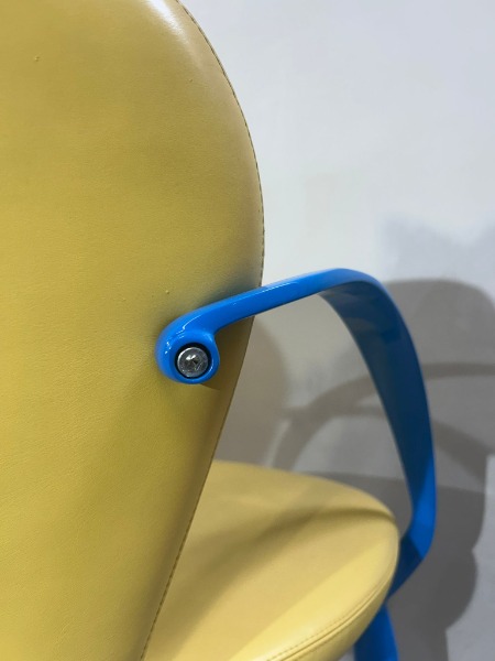 Leder in einem kräftigen Gelb. Metallbeine und Armlehnen sind in einem satten Blau.