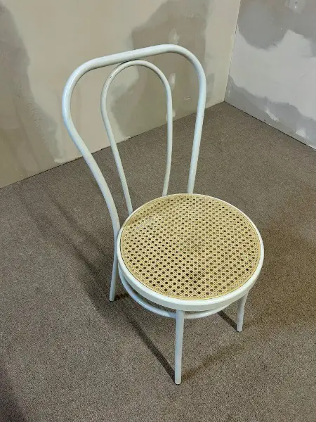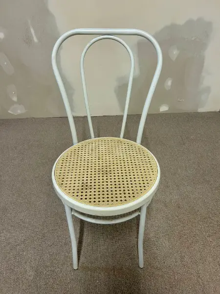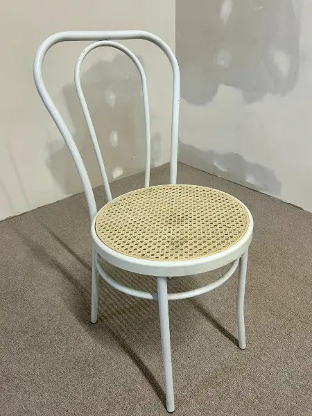 Eleganter Stuhl im klassischen Thonet-Stil, in zeitlosem Weiss lackiert. Mit seiner geschwungenen Rückenlehne und leichten Form verleiht er jedem Raum ein charmantes Bistro- oder Café-Flair. Ideal für Küche, Esszimmer oder Gastronomie.