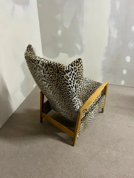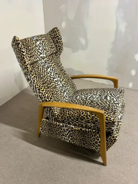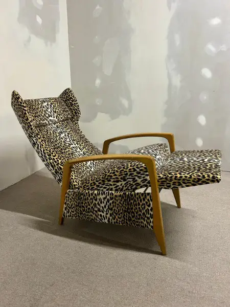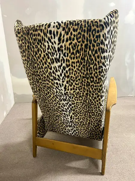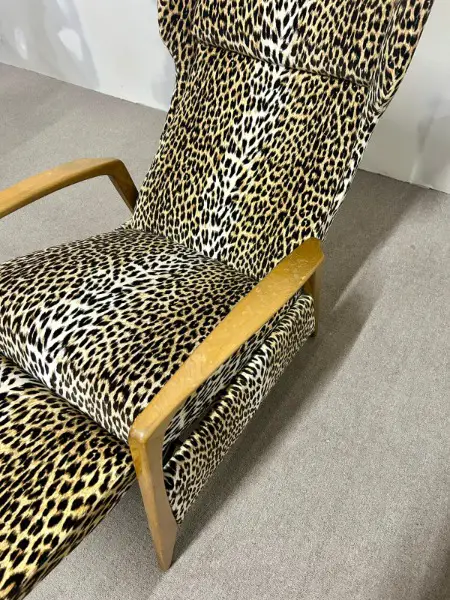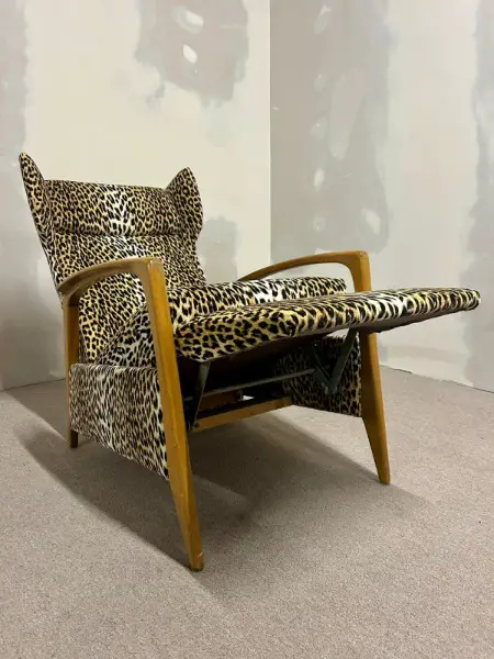 Relaxsessel aus den 1970er Jahren mit charakteristischem Leopardenmuster. Das