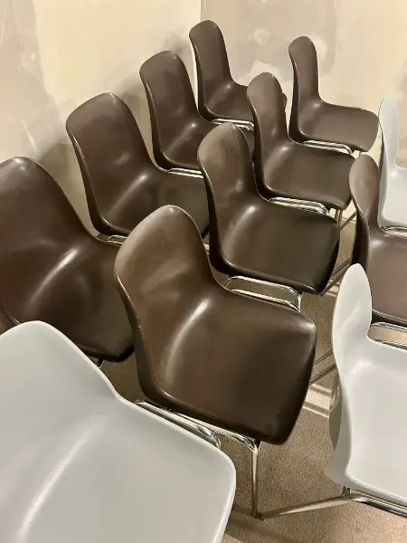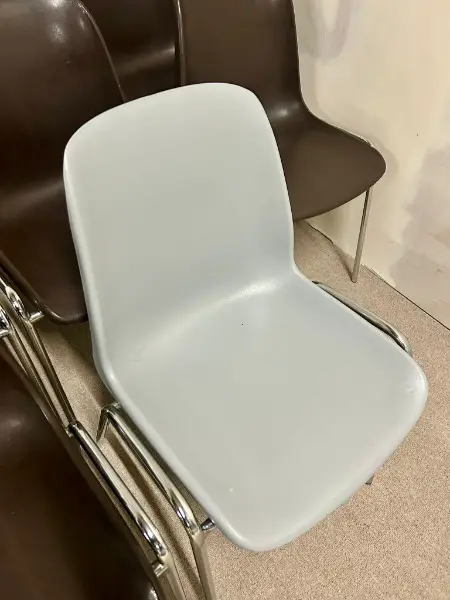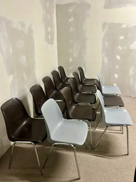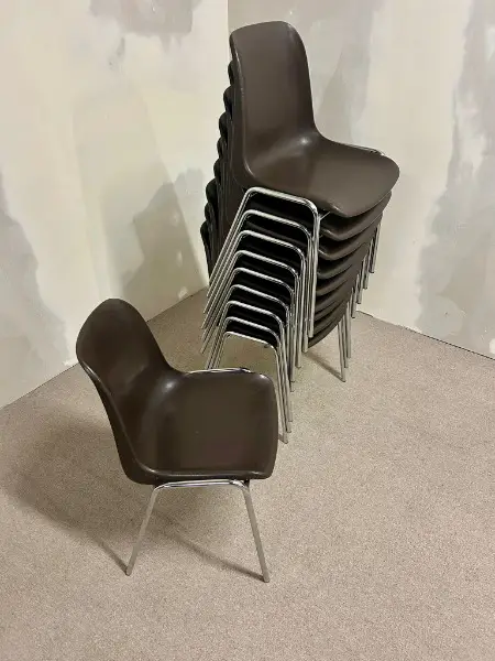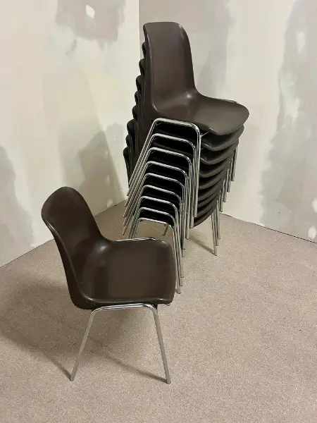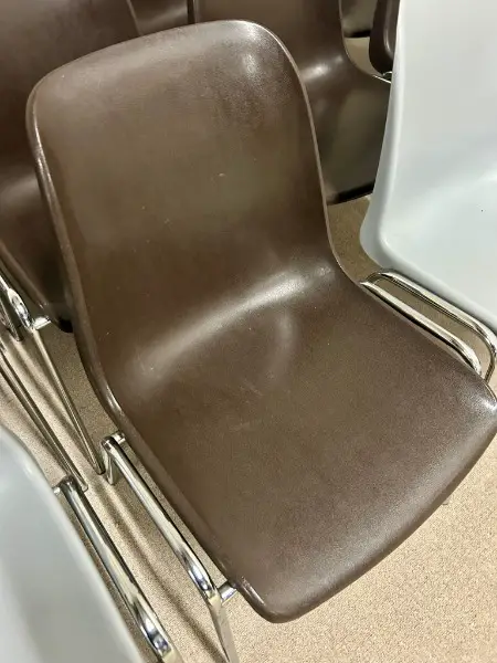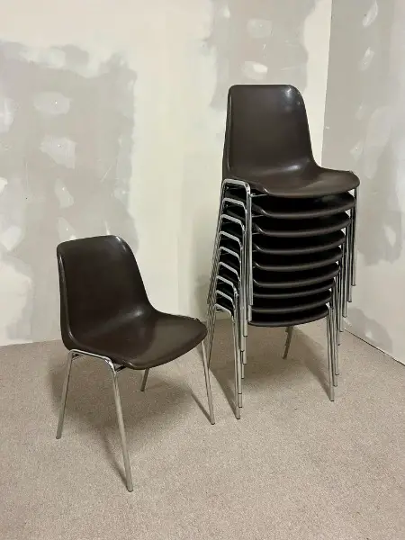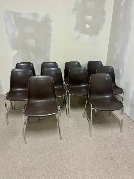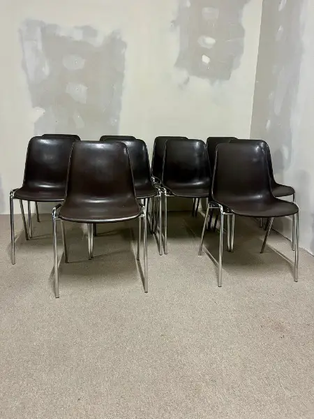 Vintage-Stühlen im ikonischen 70er-Jahre-Design, inspiriert von Helmut Starck. Das verchromte Stahlrohrgestell sorgt für Stabilität und einen zeitlosen Look. Die braunen Sitzschalen bieten Komfort und harmonieren perfekt mit dem