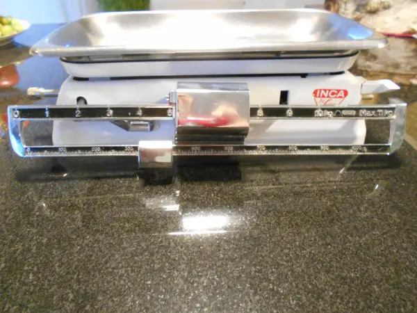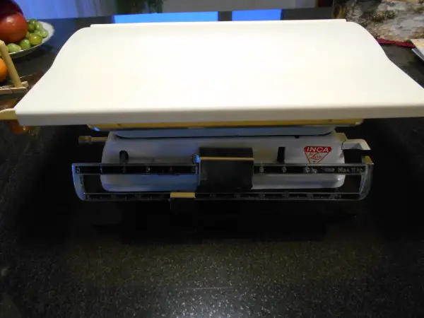 manuell mit Gewicht schieben, mit Metallschale Länge 31 cm, Breite 18 cm.