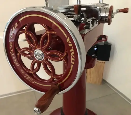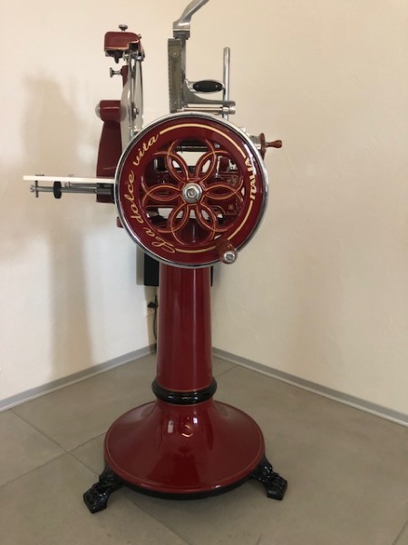 La Dolce Vita, das süsse Leben, verkörpert den Geschmack der guten alten Zeit unter Verwendung derselben Materialien wie in der Vergangenheit. Das heisst Gusseisen, verchromte Komponenten, Verzierungen und eine Ofenlackierung in rot. Die Maschine kann aber auch nach Ihrem Farbwunsch lackiert werden. Genauer und konstanter Schnitt ist garantiert. Einfache Reinigung der Maschine. Die Aufschnittmaschine ist mit einem Klingenschutzring ausgestattet.
