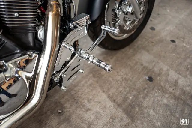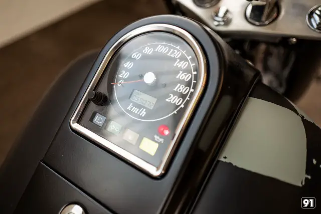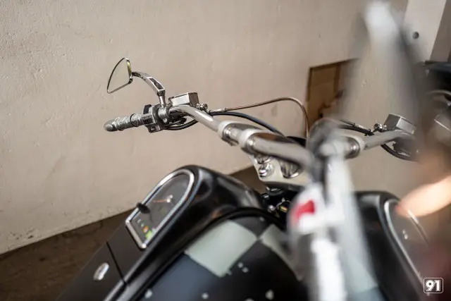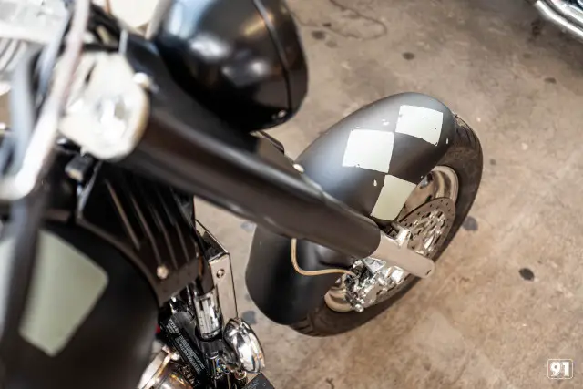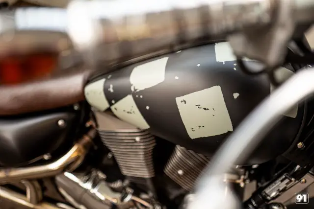 Maschine optisch deutlich kürzer und kompakter. Die spezielle «checkered flag» Lackierung ist echte Handarbeit. Ein breiter, flacher Lenker und die Vorverlegte Fussrasten Anlage sorgt für das nötige Bad Boy Feeling.