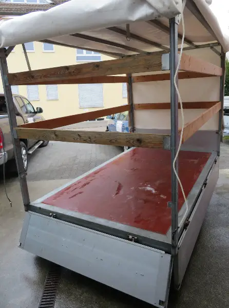 - Alle Läden abklappbar, wegnehmbar das Blachengestell ist gesteckt und kann abgebaut werden