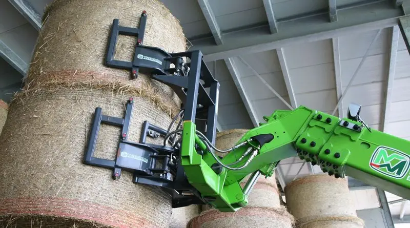 Rundballen oder mehrere Quaderballen. Der 2. Greifer kann für den Einsatz in engen Scheunen einfach demontiert werden. Aufnahme