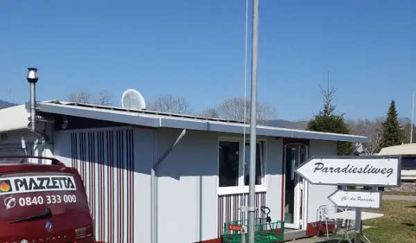 Gasheizung mit Umluft. Grosse Parzelle und Ganzjahresplatz.