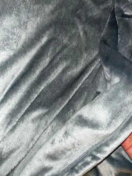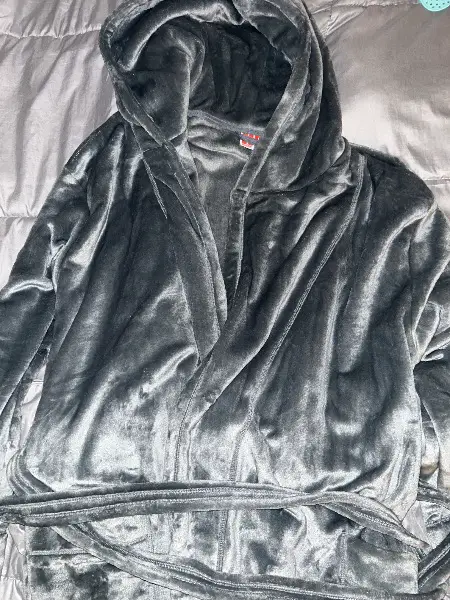 Velours-/ Mikrofaser-Material in elegantem grau. Mit Kapuze, Gürtel und praktischen Taschen - ideal für Zuhause, Wellness oder