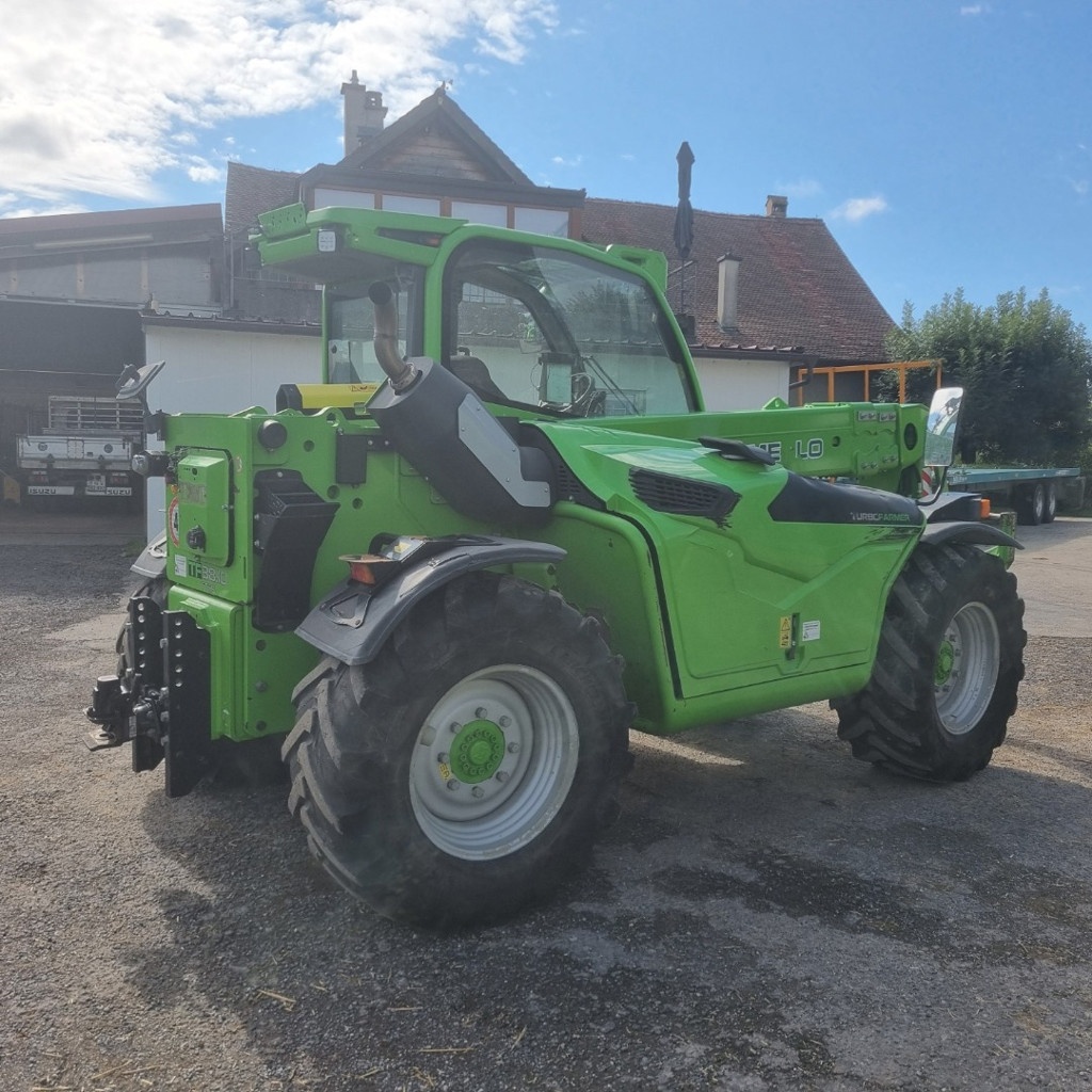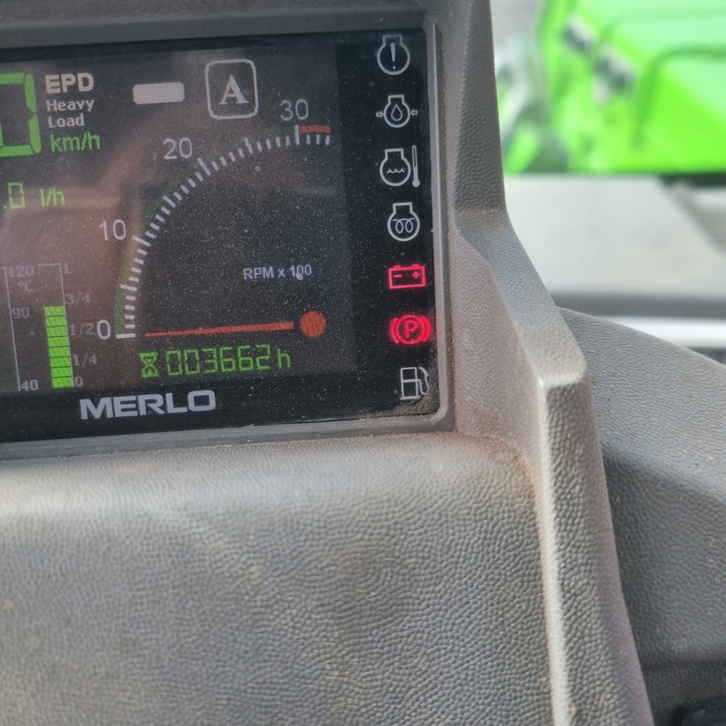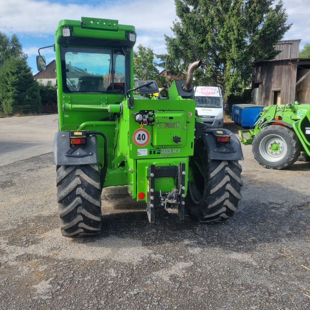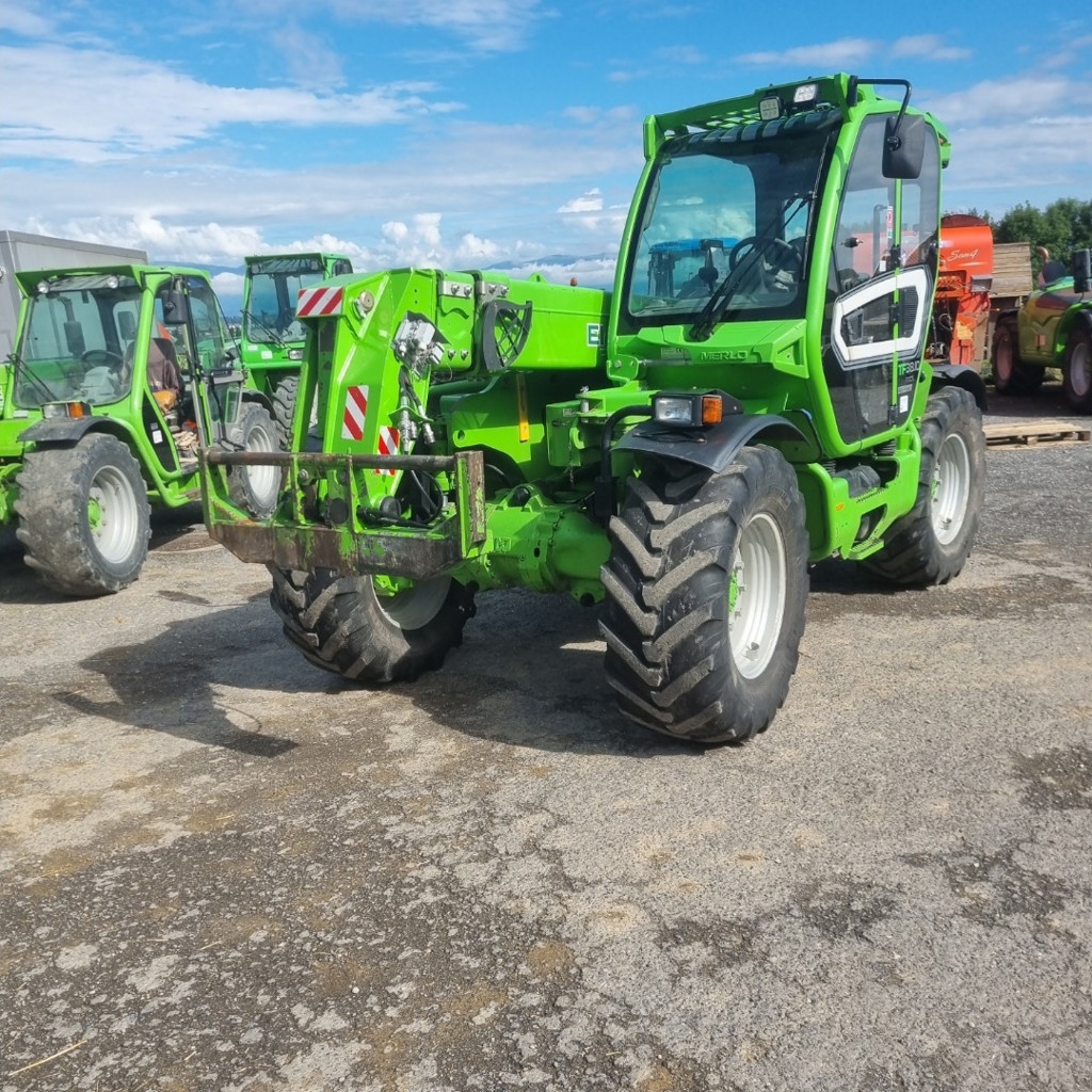 Merlo 38.10 Pneus 460x70/24 à 40%, Transmission continue, déport latéral, mise en oblique, cabine suspendue, climatisation, hauteur de levage 9.5m, 3.8 tonne moteur 140Cv, glissière d'attelage avec crochet automatique, double circuit de frein hydraulique avec soupape intelligente grand service effectué