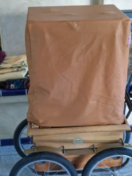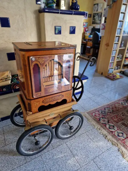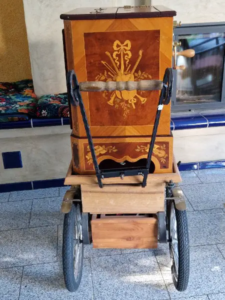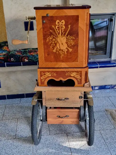 Funk somit können alle Dreorgeln mit gleichem Funk Synchron (Passspiel) spielen, Intarsien-Holzeinlegearbeiten, dunkel, mit Drehorgelwagen mit Holzräder, einer Abdeckhaube, und eine Acylscheibe zum Schutz der voderen Pfeifen.