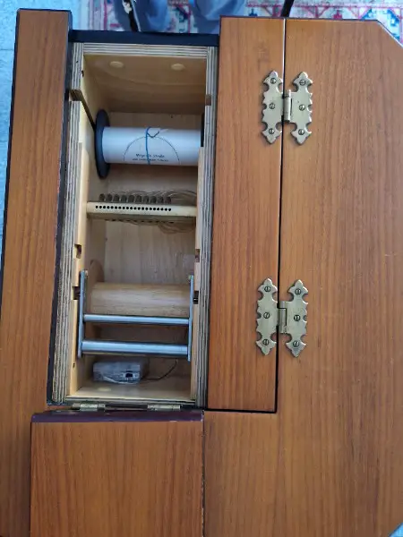 Gehäuse Birke, mehrfach verleimt, Antrieb kugelgelagert, Doppelschöpferbalg, Oberfläche Intarsien-Holzeinlegearbeiten, Mehrfach-Schichtlack
