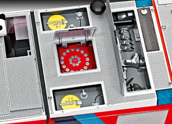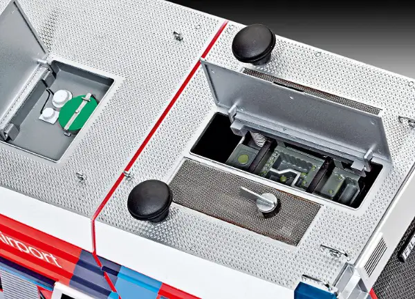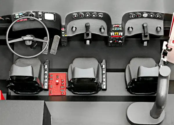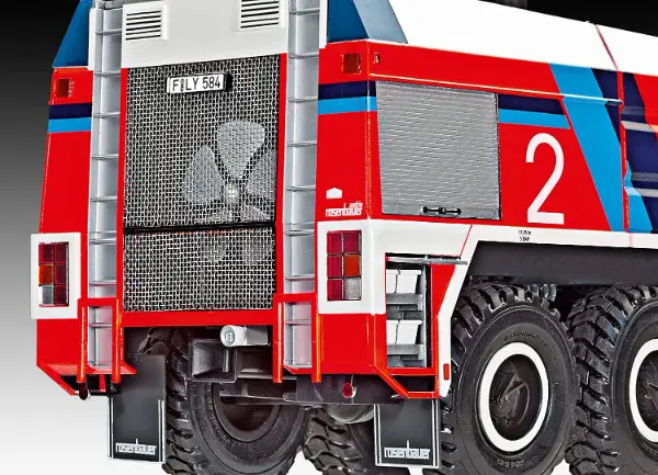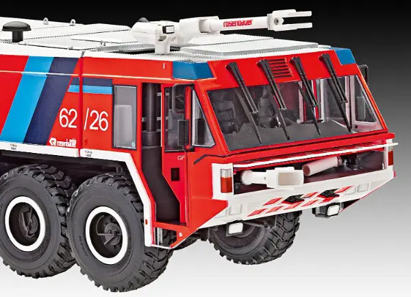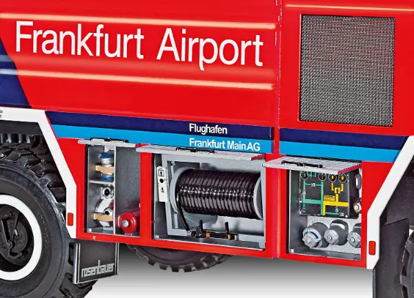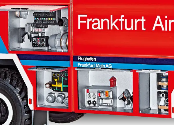 Motor / Bewegliche Fahrerhaustüren / Detailliertes Cockpit mit beweglicher Dachluke / 4-fach Scheibenwischer / Herausziehbare Schnellangriffseinrichtung / Aufstiegsleitern & Blaulichter-