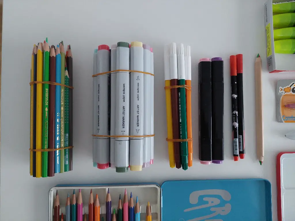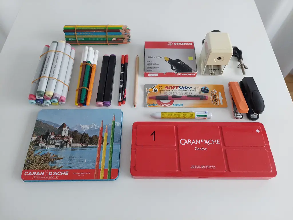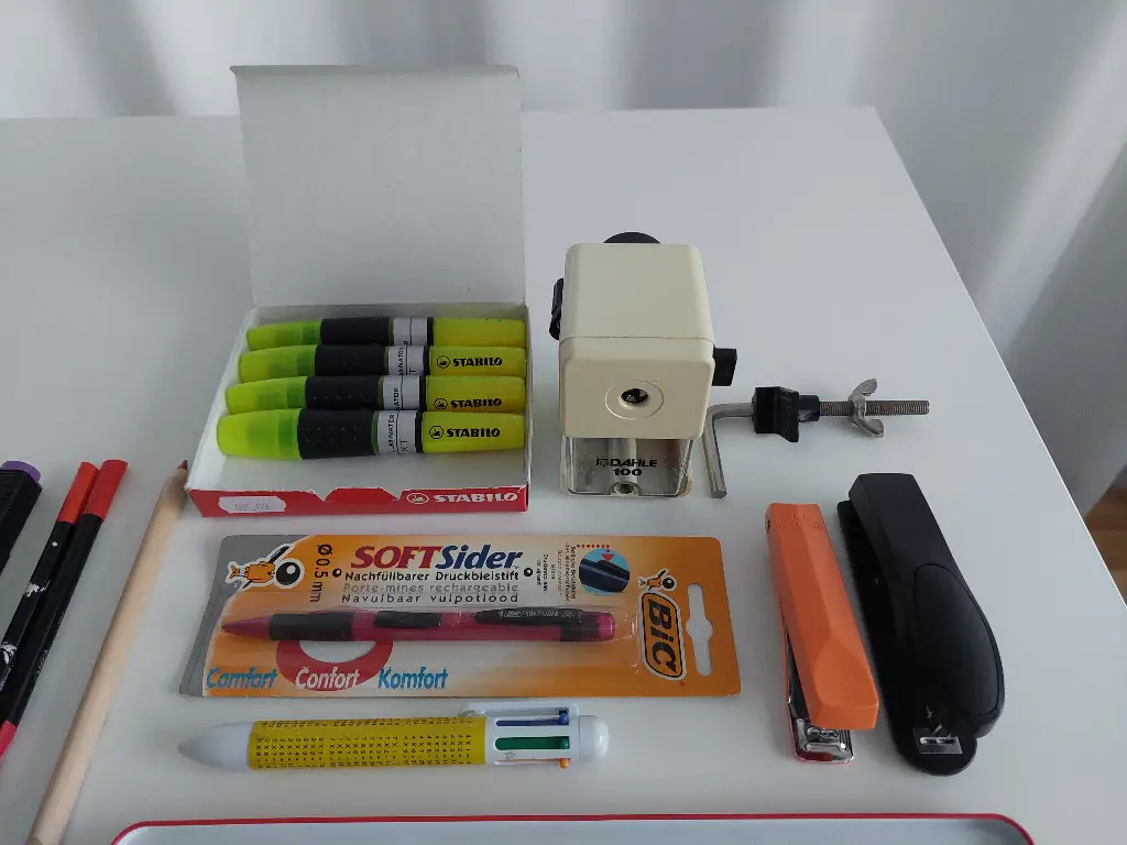 Set Farbtifte + Leuchtstifte + Malfarben + Spitzmaschine + Bostiche usw.