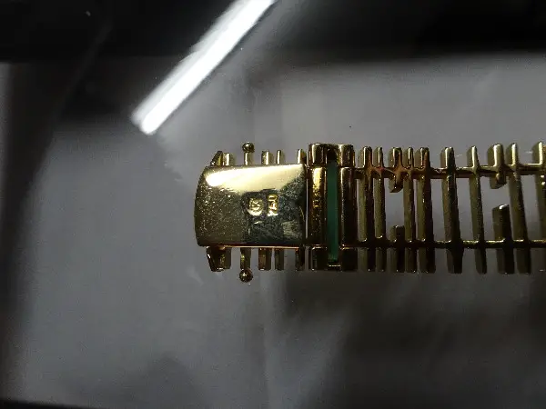 Hexagonal, Diamantboden im Zifferblatt, das Gehäuse umrandet mit Onix. Dazu ein attraktives Armband in 18 Karat Gelbgold, die Stege unterbrochen mit grünen Turmalinen.
