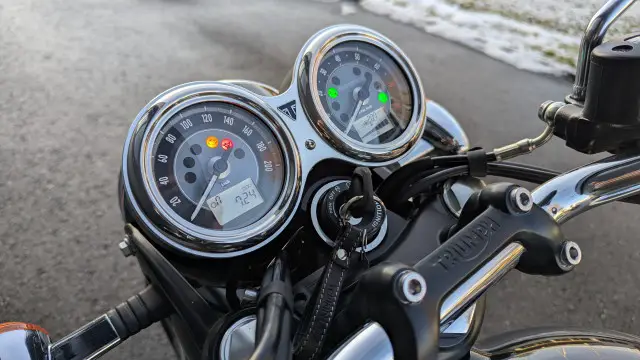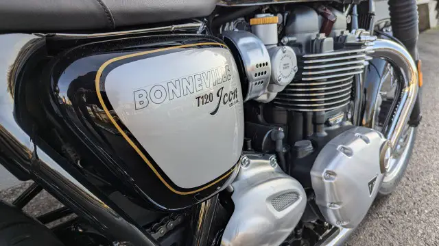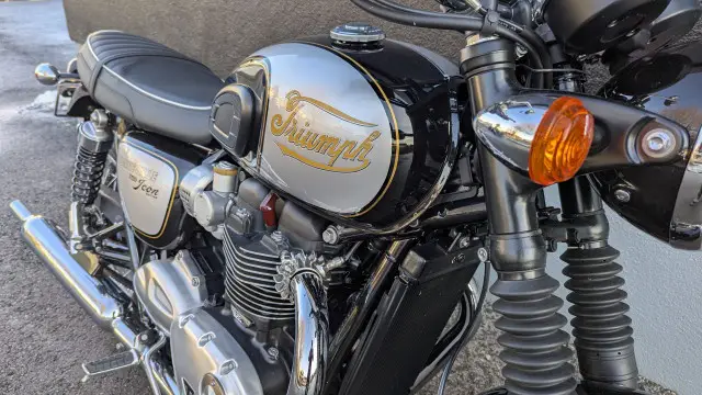 Die Bonneville T120 Icon Edition verbindet klassisches Design mit moderner Performance. Die satte Lackierung des Tanks in Sapphire Black, kombiniert mit silbernen Akzenten und handbemalten goldenen Details, unterstreicht die markante und zugleich elegante Präsenz. Der goldene Triumph-Schriftzug von 1907 auf dem Tank verleiht dem