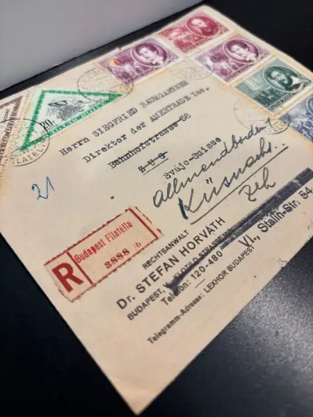 altes COUVERT mit BRIEFMARKEN SONDERMARKEN MAGYAR POSTA aus BUDAPEST UNGARN um die 1952er mit Sujet Politikeer berühmte Persönlichkeiten Wissenschaftler und Vögel Schnepfe Waatläufer Singvogel etc. // für Sammler von Sondermarken Kalter Krieg Ostblock Warschauer Pakt UDSSR Sowjetunion Philatelie Briefmarken Ornithologie Markenbogen Weltpost Sonderdruck Zeitzeugen Naturkunde Biologie Sonderbrief Zoologie historischen Dokumente