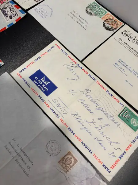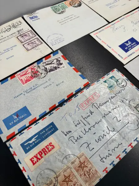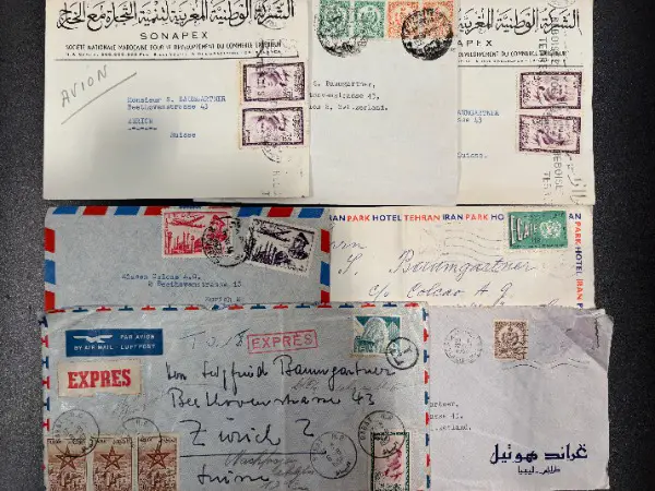 SET alte BRIEFMARKEN SONDERMARKEN BRIEF LUFTPOST INTERNATIONAL SENDUNG aus Afrika Arabischer Raum Naher Osten wie Iran Persien Marokko Lybien etc. um die 1950 - 1960 er mit Sujet Stadt City Casablanca König Kaiser Flugzeug Wappen Schah von Persien aus der Kolonialzeit etc. // für Sammler von Sondermarken Philatelie Briefmarken Markenbogen Weltpost Sonderdruck Zeitzeugen Sonderbrief historischen Dokumente Wertpapier Korrespondenz Literatur Album Couvert Druck Sondermarken PTT Post Münzen Geld Banknoten Kulturgeschichte etc. oder Fans von Asien ferner Osten Asiatika Pazifik etc. // aus gepflegtem NICHTRAUCHERHAUSHALT von der zürcher Goldküste // meiner Einschätzung nach in sehr gutem SAMMLER Zustand // Masse des Grössten Couverts über alles ca.: L 22.3cm x 11.5cm