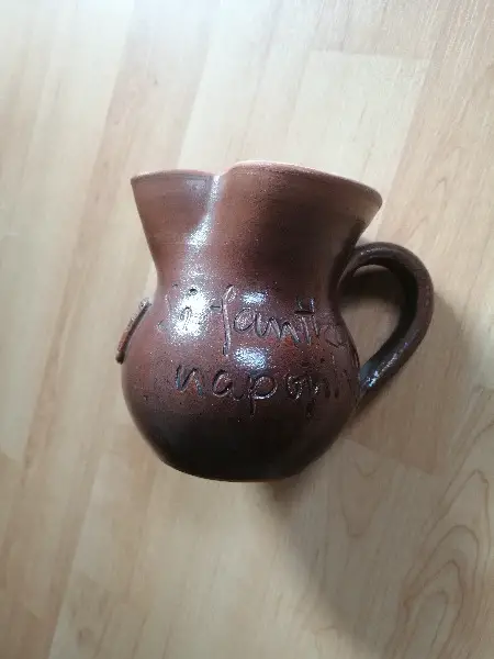 Eingeritzter Text auf den Seiten: "Majolka kaj si slnla Si fantka napojila! !" (deutsche