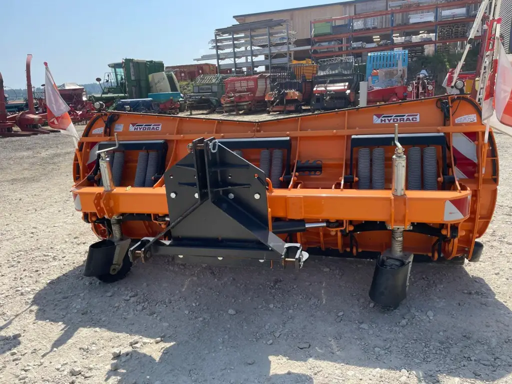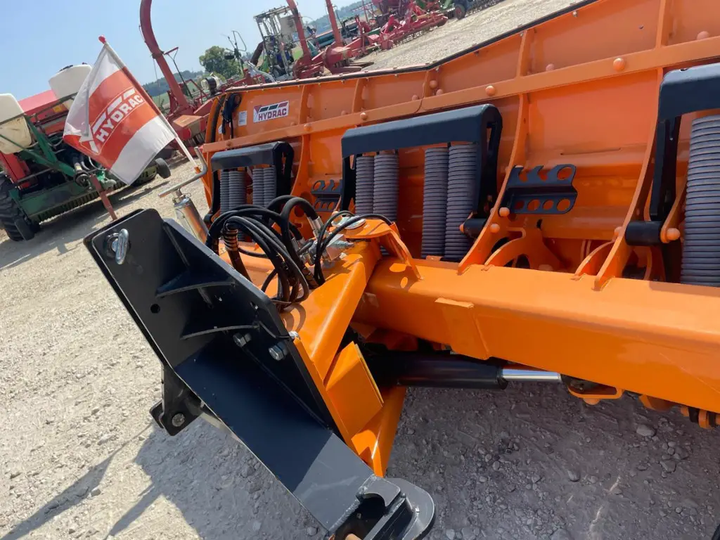 Equipement: Attelage 3 points tracteur. Lame en 3 éléments. Déclenchement par ressorts. Largeur totale 3,0 mètres, largeur de travail avec inclinaison 30°, 2,55 mètres. Hauteur 123 cm extérieur, au milieu 110 cm. Bouclier de sécurité parabolique évasive Par Tec. Lame de râclage en acier 150 X 20 mm. Roues en caoutchouc diamètre 300 mm. Extensions vissées. Déflecteurs latéraux anti-projection en caoutchouc. Feux de gabarit et signalisation.