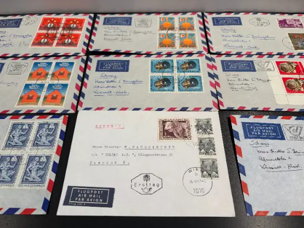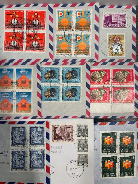 Grosses SET alte BRIEFMARKEN SONDERMARKEN ERSTTAG COUVERT LUFTPOST JUBILÄUM FEST aus der Republik ÖSTERREICH um die 1957 - 1974 er // mit Sujet Vereinte Nationen EU Eropäische Union Welkugel Flagge Fahne Säule Stadt City Wien Kultur Flamme Kranz Kloster Mariazell