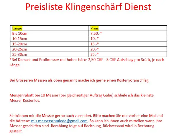 Hobby macht es wieder scharf. Ich verwende den Konvexschliff, auch Balliger Schliff genannt. Dieser zeichnet sich durch bessere Schnitthaltigkeit aus. Das Messer können Sie nachdem problemlos mit Handelsüblichen Schärfgeräten nachschärfen. Der obige Preis bezieht sich auf ein 10 cm langes Messer. Die Preisliste finden Sie oben bei den Bildern. Falls ich Ihr Interesse geweckt habe, können Sie mir gerne eine Mail auf die Email mls.messerschmiede@gmail.com schicken.