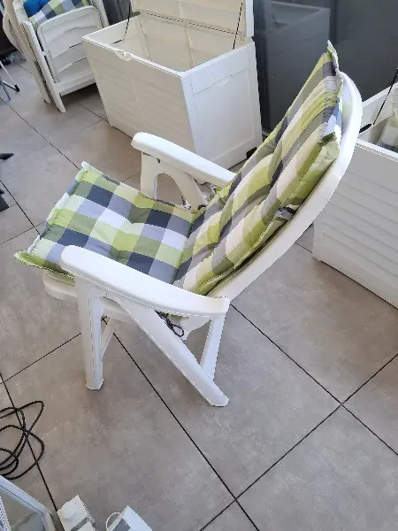 Vier gebrauchte, aber gut erhaltene, weisse Gartenstühle aus Kunststoff. Ideal, um die warmen Tage draussen zu geniessen! Der Stuhl ist leicht, robust und wetterfest – perfekt für den Garten, Balkon oder die Terrasse. Er lässt sich einfach reinigen und platzsparend verstauen. Geniessen Sie entspannte Stunden in diesem bequemen Gartenstuhl. Leichte Gebrauchsspuren sind vorhanden. Wird mit vier Kissen verkauft.