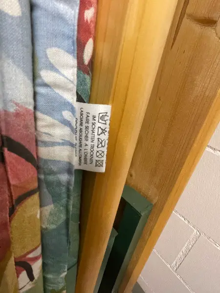 Dieses Set besteht aus einem Tisch, zwei Bänken in braunem Holz und den entsprechenden Sitzkissen..