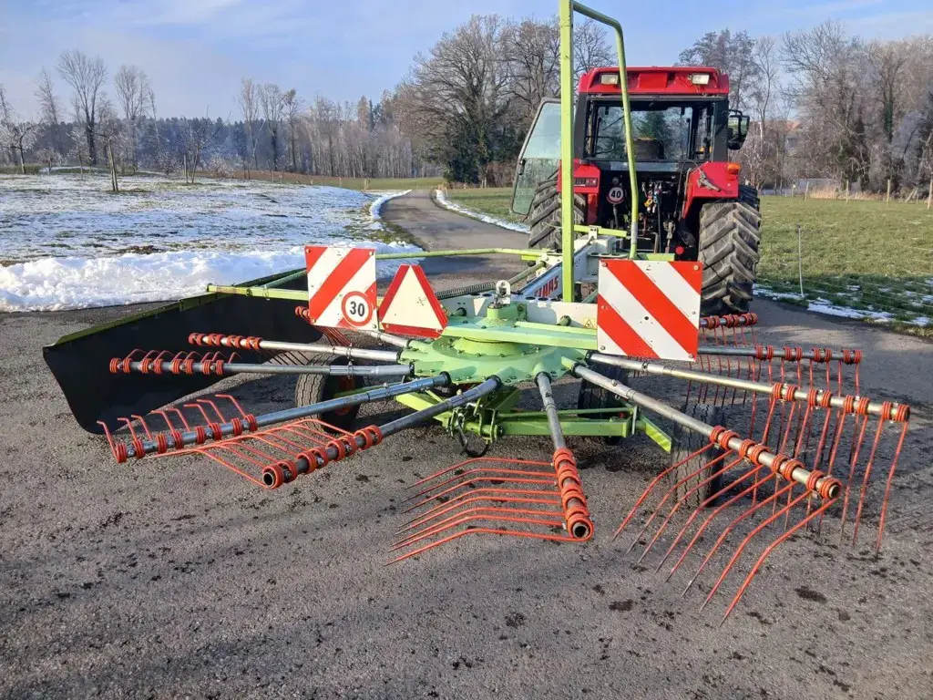 Schutzbügel inkl. Schwadtuch / Tastrad / Bereifung 18x8.50-8 / 13 Zinkenträgerrohre mit je 4 Doppelfederzinken / Warntafeln / 1 ew Steuerventil erforderlich.