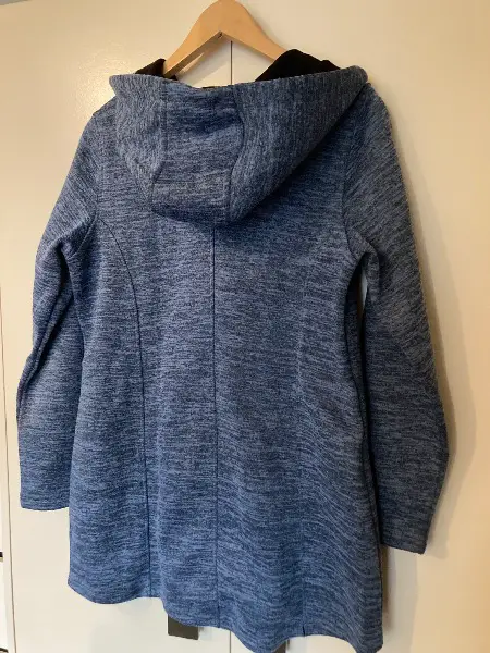 Mit Kapuze und zwei Aussentaschen, blau-meliert, weich, hüftlang, einmal getragen, daher neuwertig.