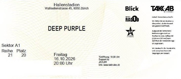 2 Tickets für Deep Purple Konzert am Freitag 16.10.2026 im Hallenstadion Zürich.