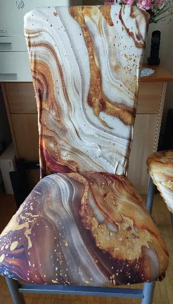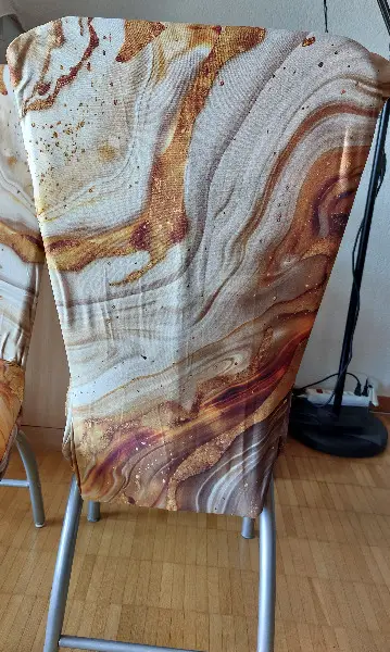 Verkaufe diese wunderschönen, neuen und gewaschenen Stuhlsocken in edler Marmoroptik. Sie sind elastisch, passen sich perfekt Ihren Stühlen an und schützen diese vor Kratzern und Abnutzung. Gleichzeitig werten Sie Ihre Stühle optisch auf und sorgen für ein modernes Ambiente. Ideal für Esszimmerstühle. 88% Polyester & 12% Elasthan.
