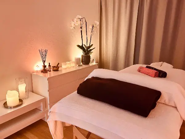 Entspanne dich in einem schön vorbereiteten Raum. Kerzenlicht, Musik, sinnliche Düfte und Öl.