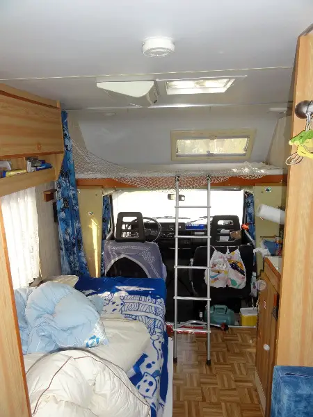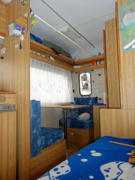 Fahrwerk gut, absetzbare Kabine, Innenraum mit Grundausbau (Isolierung, Bett) .