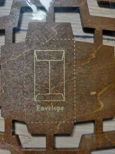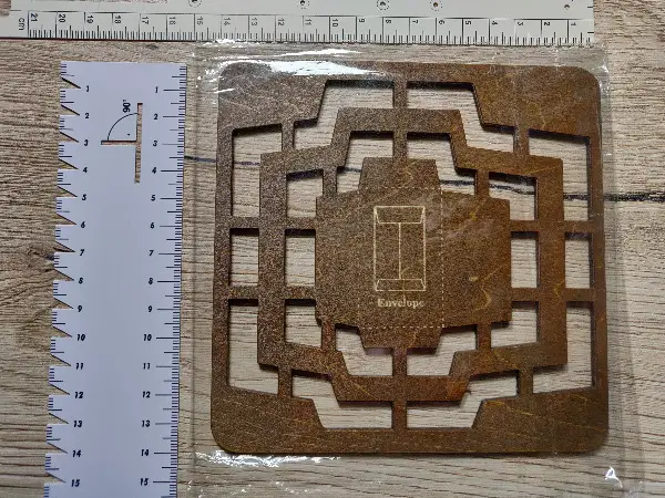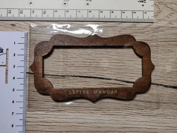 1x Schablone Briefumschlag und 1x dekorative Schablone Label Etikette. Beide Schablone sind aus Holz, neu und originalverpackt.