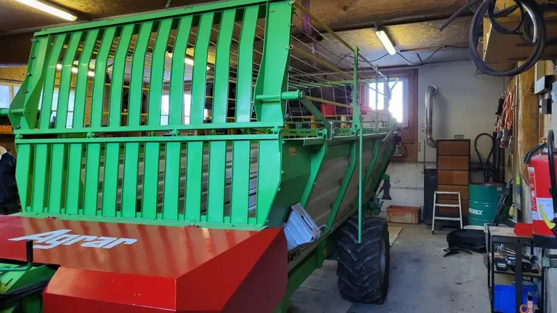 Hydr. Kratzboden, mech. Scherengitteraufbau, Seiltüre hinten, auf Wunsch mit hydr. Knickdeichsel, hydr. Anhängerbremse 1-Leiter, 6 Messer, Reifen 425/55 R17 neuwertig,
