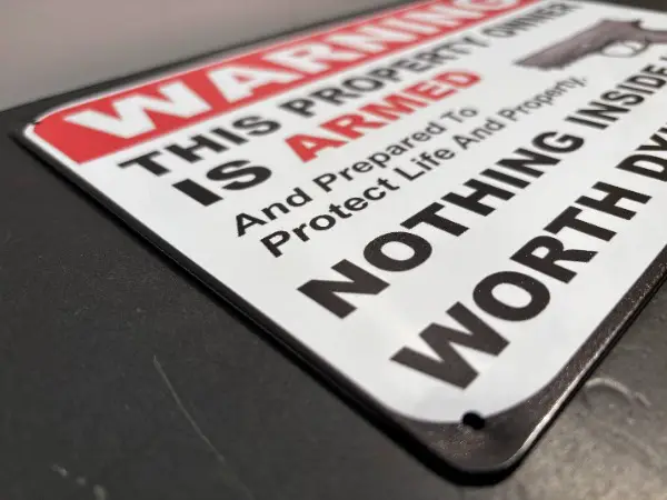 nettes Fun-Blechschild MIT UNMISSVERSTÄNDLICHEM STATEMENT für Sammler von Waffen Pistole oder Militär Armee Militaria Tactical etc. // solides Metallschild - Warnschild MIT SUJET PISTOLE in klassisch nettem USA-Style zur Abschreckung von unerwünschten Besuchern, Einbruchschutz, Alarmanlage, freundliche Begrüssung, Abschreckung von Wegelagerer, Hausierer, Missionare, Einbrecher als Ergänzung zu Flutlicht oder Bewegungsmelder oder für an den Tresor