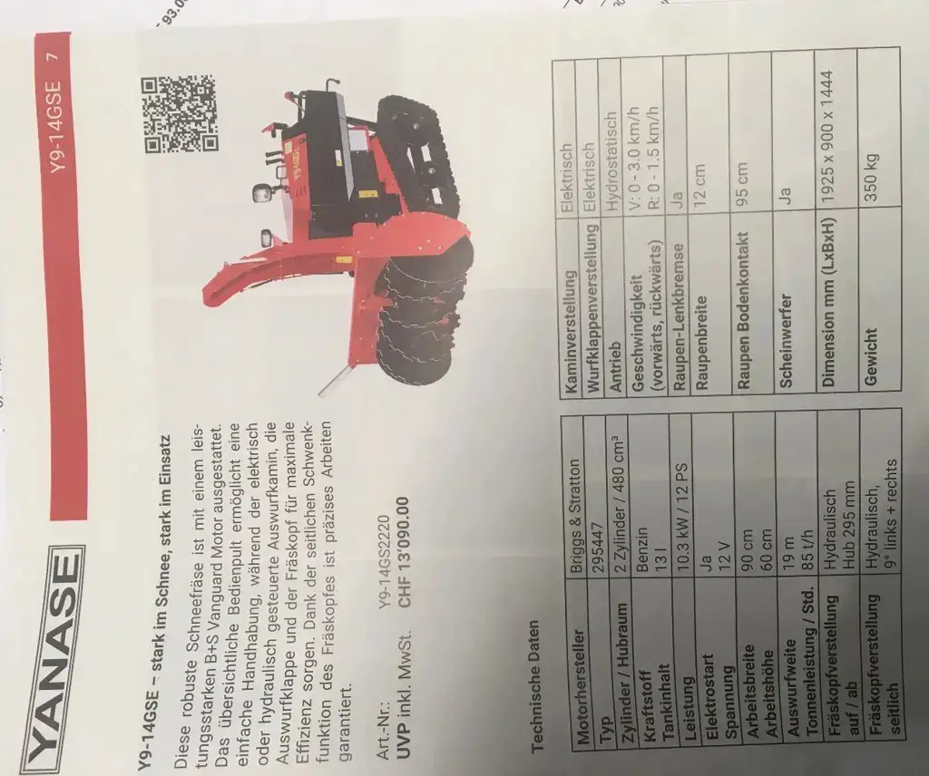 Schneefräse Yanase 2 Zyl.14 PS, mit Raupen180x900