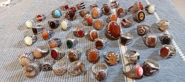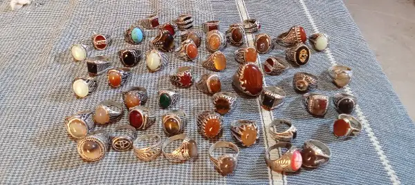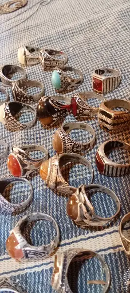 56 Heeren Ringe, mit Schmuck Steinen aus der Sahara. Die Ringe wurden von Berbern angefertigt und der wirkliche Ursprungort ist unbekannt. Entweder massiv 925 Silber, versilbert oder Plastik, Messing, Stahl.