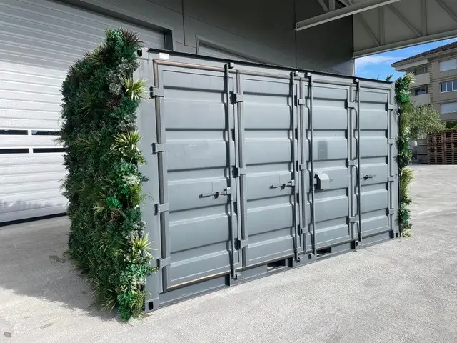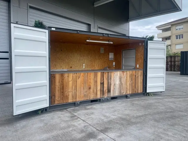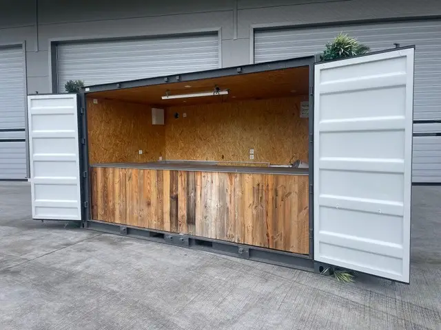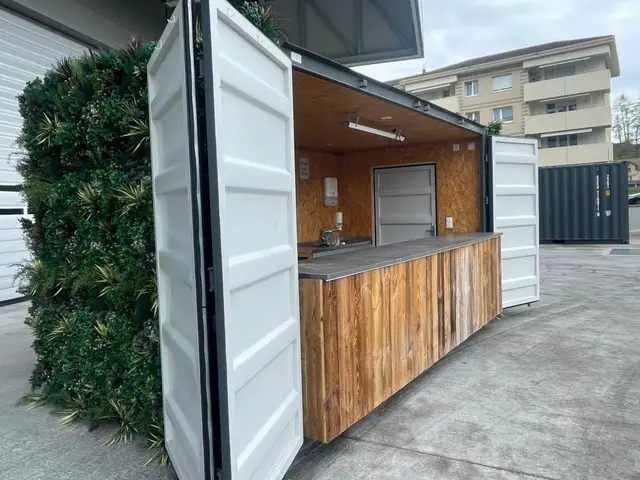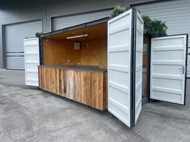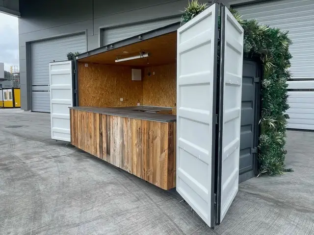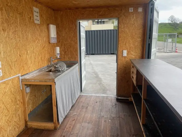 Bemerkung: 15' BAR-Container, Aussenmasse ohne Begrünung: 4500x2500x2590mm (LxBxH) , Aussenmasse mit Begrünung (zirka) : 5000x2800x2700mm (LxBxH) , Holzboden, diverse Bareinrichtung und mit ausfahrbarer Theke, diverse Elektro- und Sanitärinstallationen!