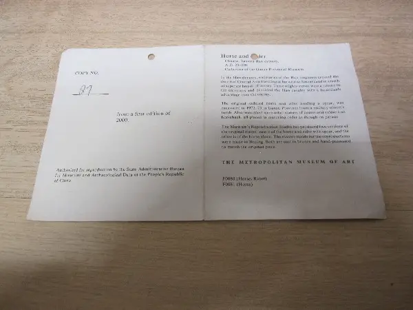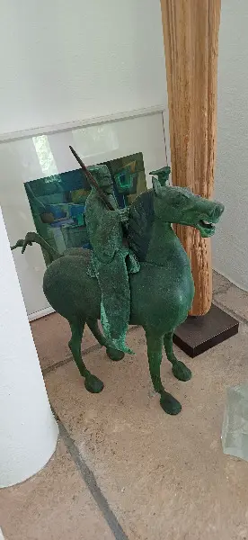 Bronze-Kopie (No 27) von Objekten der Han Dynastie aus dem chinesischen Provinzmuseum in Gansu, die 1980 für den Museumsshop einer Ausstellung in New York hergestellt wurden. Die Replika aus Bronze wurde von Hand patiniert, um das Original so getreu wie möglich zu verkörpern.