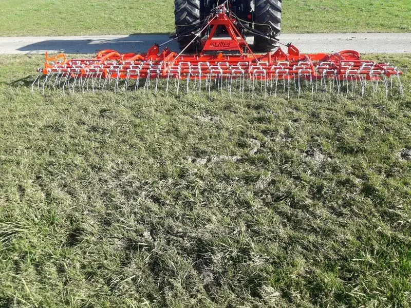 Die wendbaren Gusssterne ebnen die Grünlandflächen. Die Schiene an der Front planiert die Maulwurfhügel, Tierkot wird zerkleinert. Die nachlaufenden Striegelzinken schaffen eine hervorragende Belüftungsarbeit, und arbeiten Güllenreste ein.