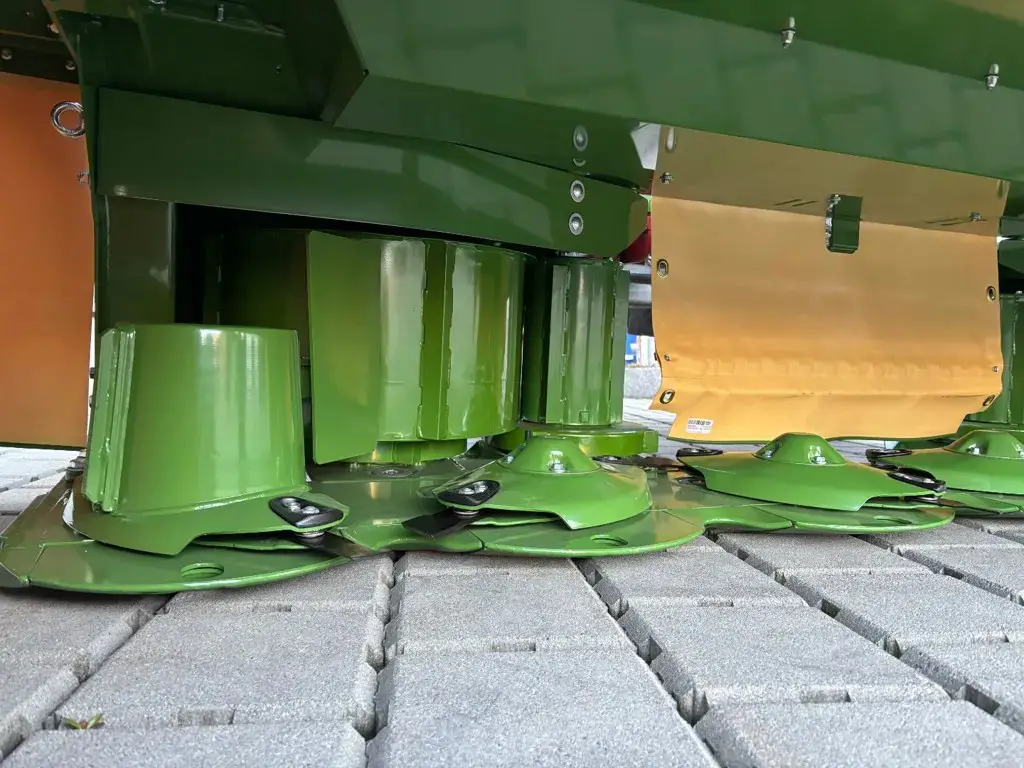 Frontscheiben Mähwerk mit Safe Cut Mähscheibensicherung, 4 aktiv angetrieben Schwadtrommeln für ein schmales Schwad, ideal zum Eingrasen und schmale Traktoren, Klingenschnellwechsel, Pendelbock.