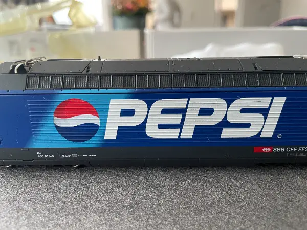 Dunkelblaues Gussgehäuse mit schwarzem Rahmen und schwarzem Dach, weisse Aufschriften, rote SBB-Embleme, weisse Aufschrift: "PEPSI", mehrfarbige PEPSI-Embleme auf hellblauem Grund.