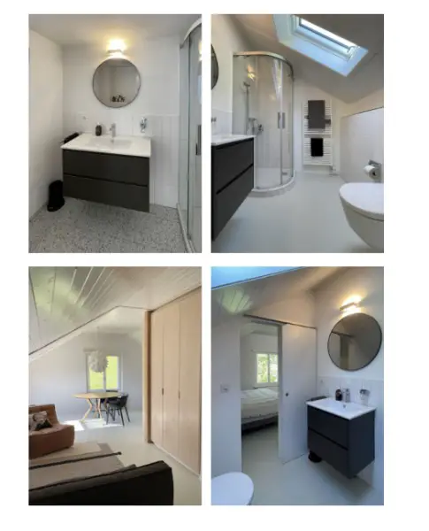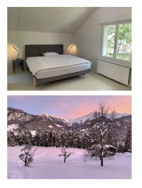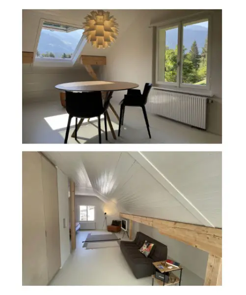 Alp, inmitten eines Waldes und man braucht ein Auto um hinzukommen (im Winter 4x4 und Schneeketten) . Die Wohnung in Sagogn hat eine Dachschräge. Sie beinhaltet Küchenzeile, Sofas und ein Doppelbett. Das Badezimmer ist separat.