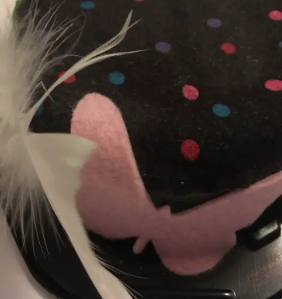 Farbiger Deko Capelllo, schwarzer Plastikdeckel mit farbigem Stoff überzogen und Filz Blumen in der Farbe dunkelgrün, hellgrün, weiss, rosa, und mit rosa Filz Schmetterling und weisse Federn