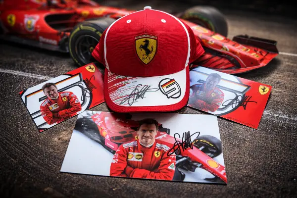 Die angebotenen Stücke stammen aus der Nähe meines Wohnortes, wo Sebastian Vettel wohnt. Die besondere Sammlung ist aus der Ferrari-Ära und zeigen Vettel im klassischen Ferrari Rennanzug mit Sponsoren wie Shell, UPS und Kaspersky.